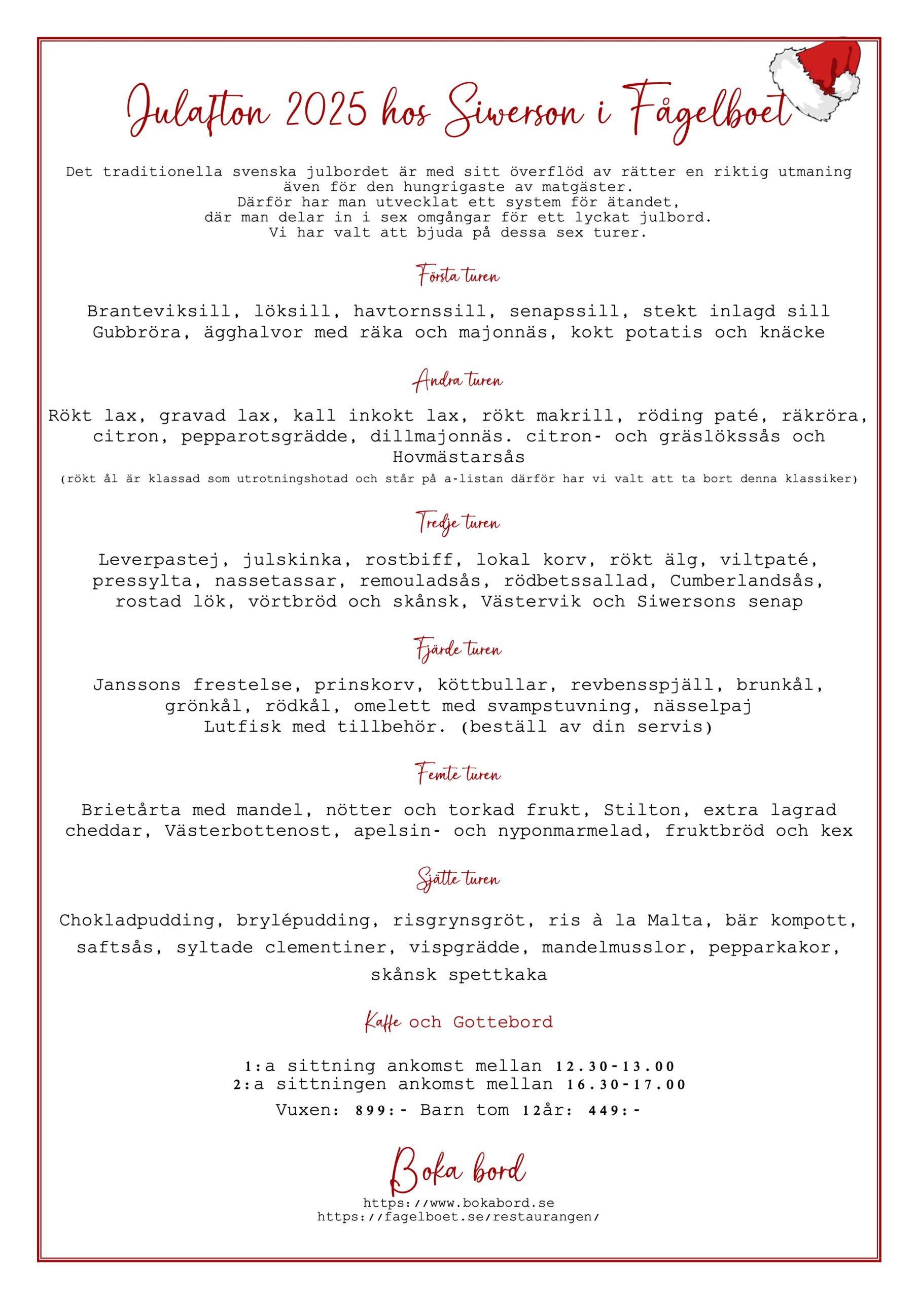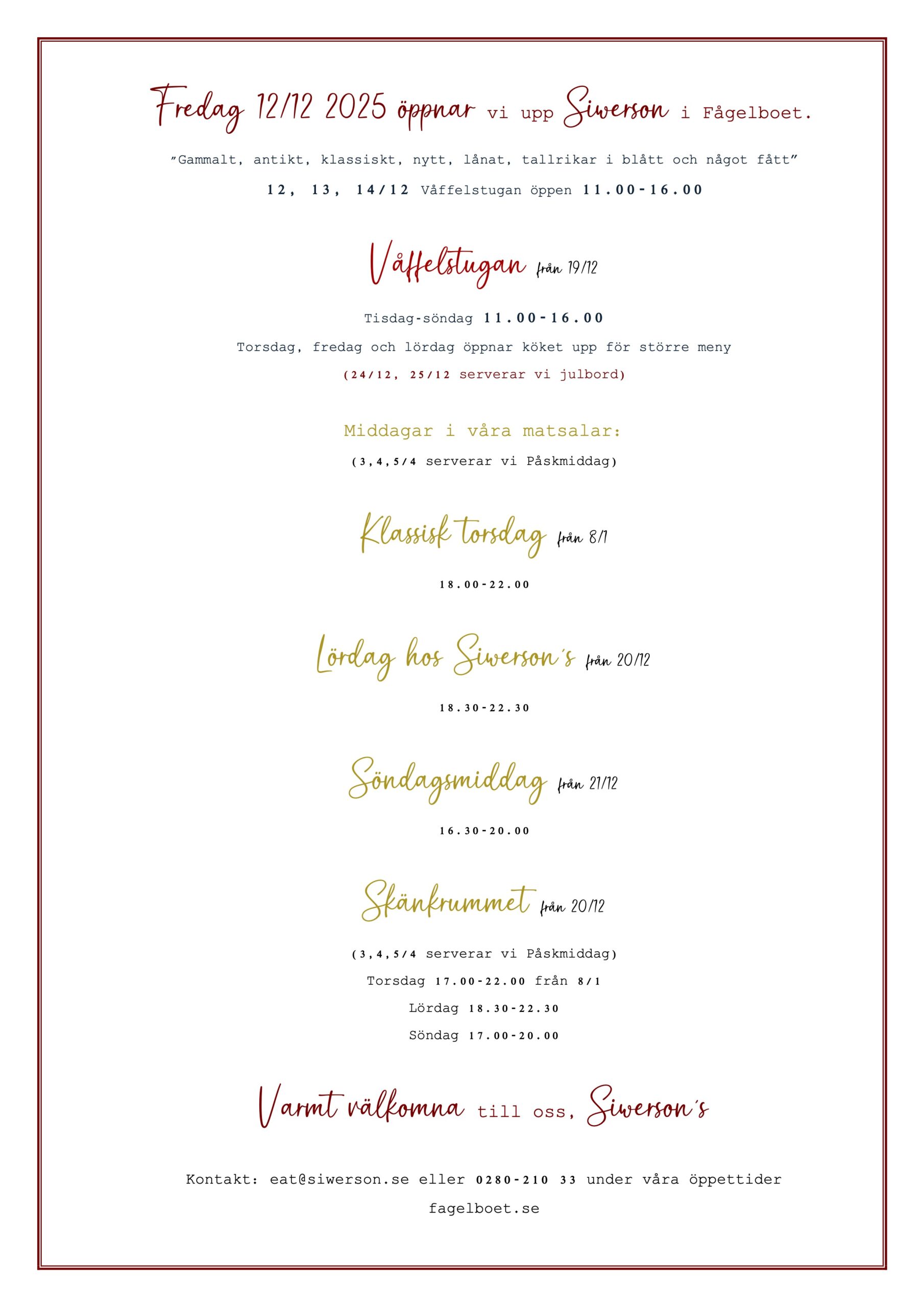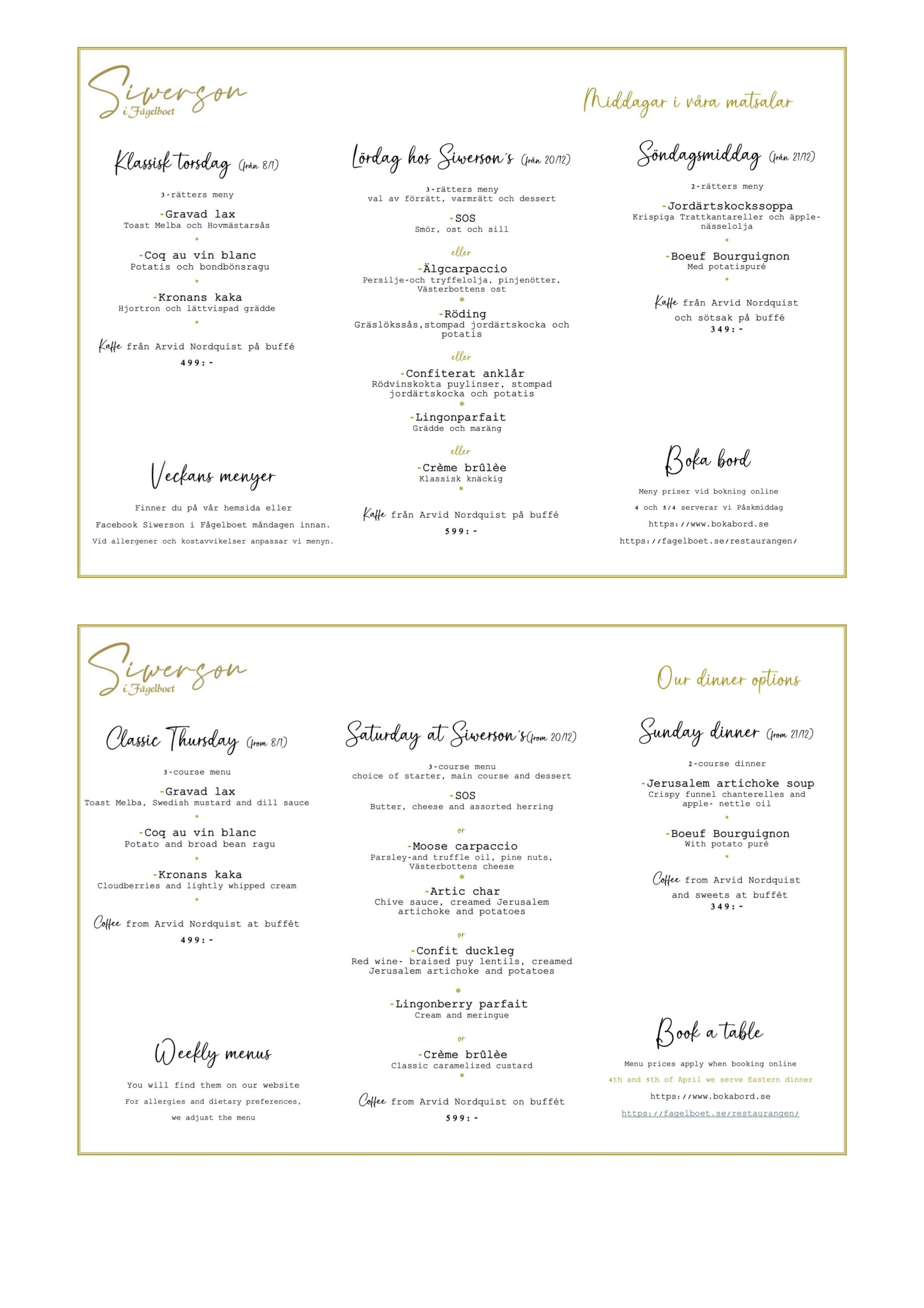 Lördag hos Siwerson, 3-rätters meny där ni väljer förrätt, varmrätt och dessert. Kaffe på buffé ingår. Boka bord till någon av våra klassiska middagar. Måndagen innan finner ni veckans olika menyer hos Siwerson i Fågelboet på Facebook.