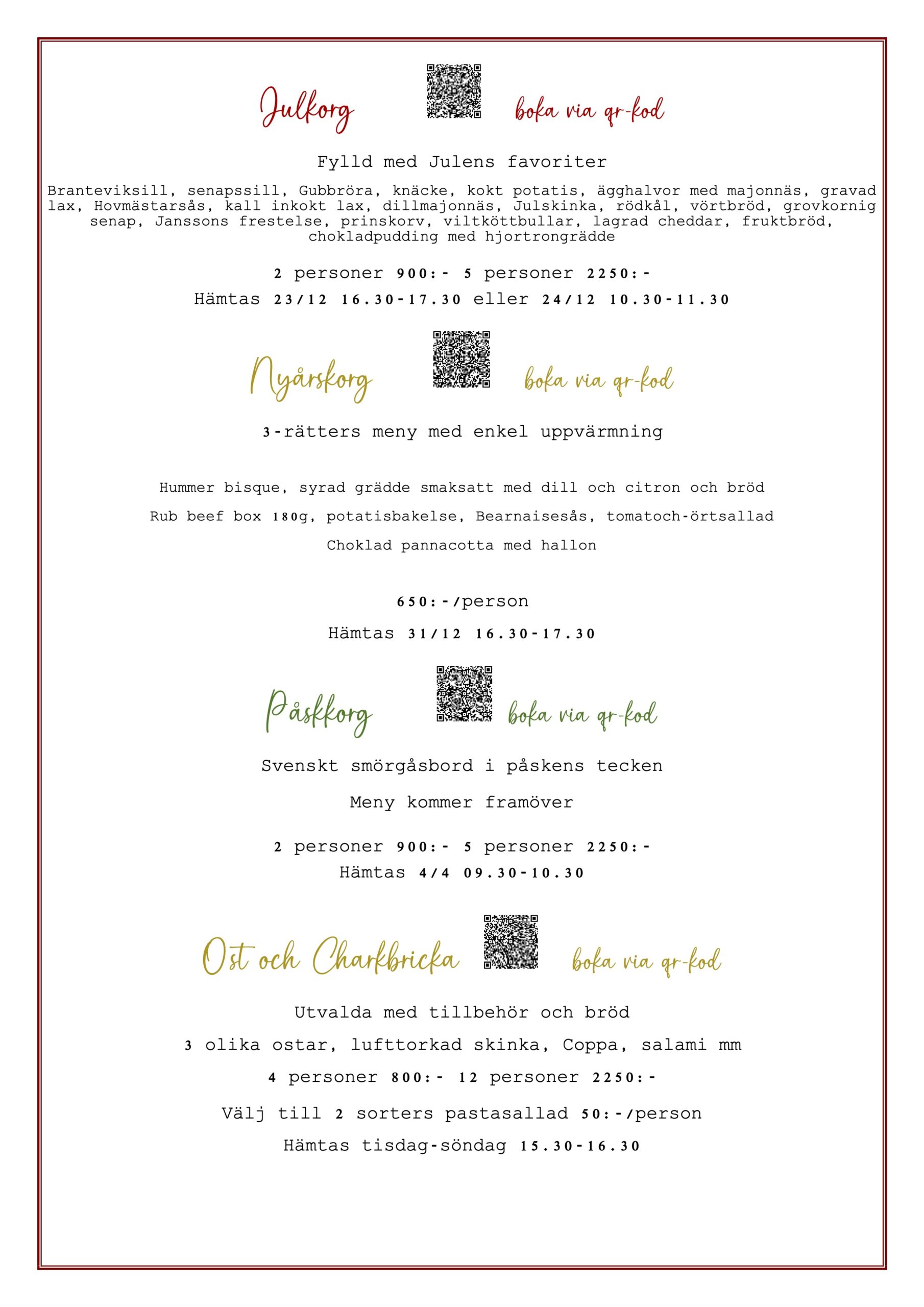 För er som önskar hämta se våra korgar. Besök gärna vårt nya skänkrum och bar som serverar enklare rätter kvällstid under våra öppettider.