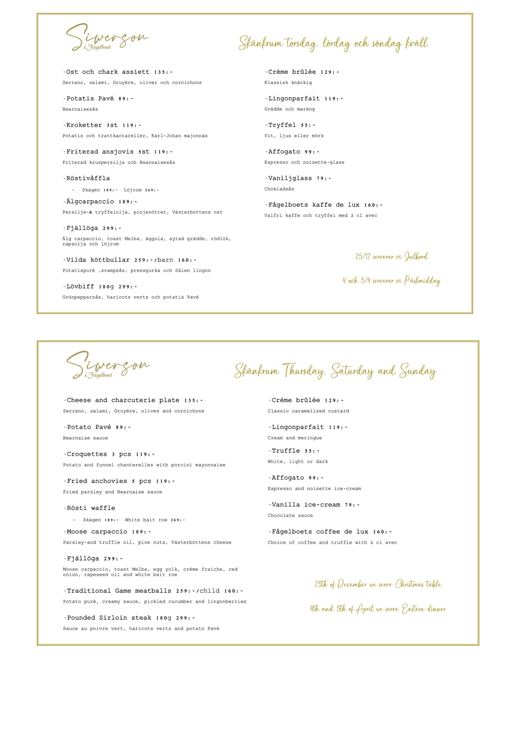 Julbord serveras på Julafton. Juldagen dukar vi upp till Julbords taberas Där ni gäster äter all framdukad mat och gör rent bord med kaffe på buffé. Påskmiddag serveras Långfredagen, Påskafton och Påskdagen.